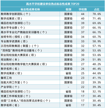 從統(tǒng)計數(shù)據(jù)來看,國家級教師教學(xué)創(chuàng)新團(tuán)隊成為“雙高計劃”56所高水平學(xué)校建設(shè)單位標(biāo)志性成果最熱詞匯,44所院校(78.6%)均將建設(shè)國家級教師教學(xué)創(chuàng)新團(tuán)隊列為標(biāo)志性成果;其次是國家教學(xué)成果獎、國家精品在線開放課程、國家高水平專業(yè)群、國家高水平專業(yè)化產(chǎn)教融合實訓(xùn)基地,分列第2至第5位,超過60%的院校標(biāo)志性成果中涵蓋了這些指標(biāo)。