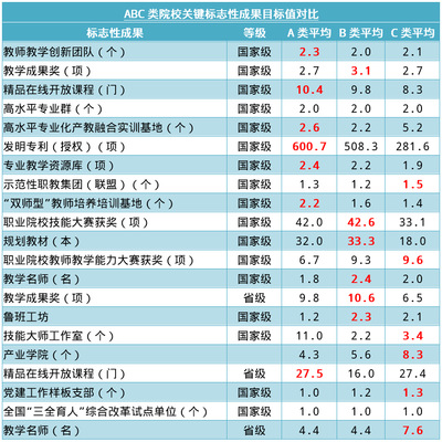 ABC三類院校關(guān)鍵標(biāo)志性成果目標(biāo)設(shè)置對比: