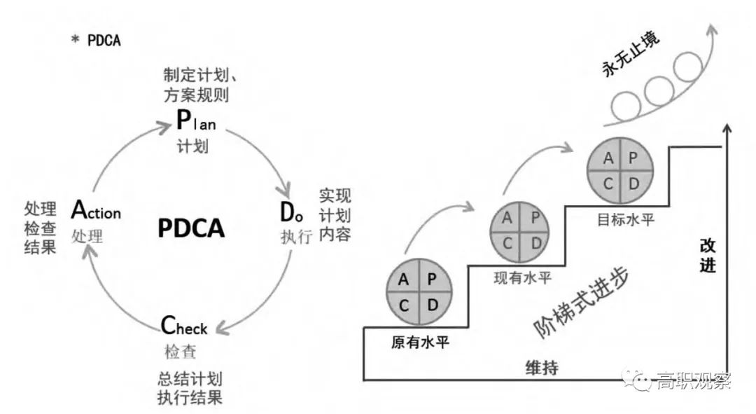 PDCA循環(huán)是實現(xiàn)“雙高”建設(shè)質(zhì)量呈階梯式上升的重要手段。“P”即計劃階段,主要指學(xué)?!半p高”建設(shè)方案和任務(wù)書的制定、年度任務(wù)的分解和再制定、績效指標(biāo)的制定等;“D”是執(zhí)行階段,主要指實施項目建設(shè)內(nèi)容,旨在做好過程質(zhì)量管理;“C”即檢查階段,主要指分析項目實施的效能,找出建設(shè)過程中的問題,不定期地對項目建設(shè)情況進行評價,并根據(jù)評價持續(xù)保持高效的建設(shè)狀態(tài);“A”即處理階段,主要指對檢查階段發(fā)現(xiàn)的問題進行整改和糾偏,保證項目的順利運行。其中,檢查階段和處理階段是PDCA循環(huán)實現(xiàn)質(zhì)量提升的關(guān)鍵。在過程化管理的動態(tài)監(jiān)管中,對進度滯后的、指標(biāo)完成度達不成的、任務(wù)內(nèi)容需要調(diào)整的情況開展分析,尋找有效解決方法,保證整個“雙高”建設(shè)任務(wù)能夠順利的、保質(zhì)保量的完成。學(xué)校層面對每個建設(shè)項目的管理、每個建設(shè)項目對子任務(wù)的管理、子任務(wù)對具體建設(shè)要點的管理都應(yīng)建立PDCA循環(huán)機制,實現(xiàn)“整個雙高建設(shè)項目——項目內(nèi)子任務(wù)——子任務(wù)到具體建設(shè)”的多層PDCA循環(huán),最終實現(xiàn)大環(huán)套小環(huán)、循環(huán)螺旋上升的狀態(tài)。