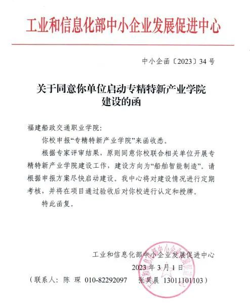 3月1日,工業(yè)和信息化部中小企業(yè)發(fā)展促進中心公布首批“專精特新產(chǎn)業(yè)學(xué)院”啟動建設(shè)名單,我校申報“船舶智能制造專精特新產(chǎn)業(yè)學(xué)院”經(jīng)過歷時半年的初審、線上考察、專家初評、專家會評等4輪競爭性遴選,最終從800多所高校中脫穎而出成功獲批立項建設(shè)。此次“專精特新產(chǎn)業(yè)學(xué)院”獲批建設(shè),標(biāo)志著我校在產(chǎn)教融合校企合作提質(zhì)升級上又邁出了堅實的步伐。