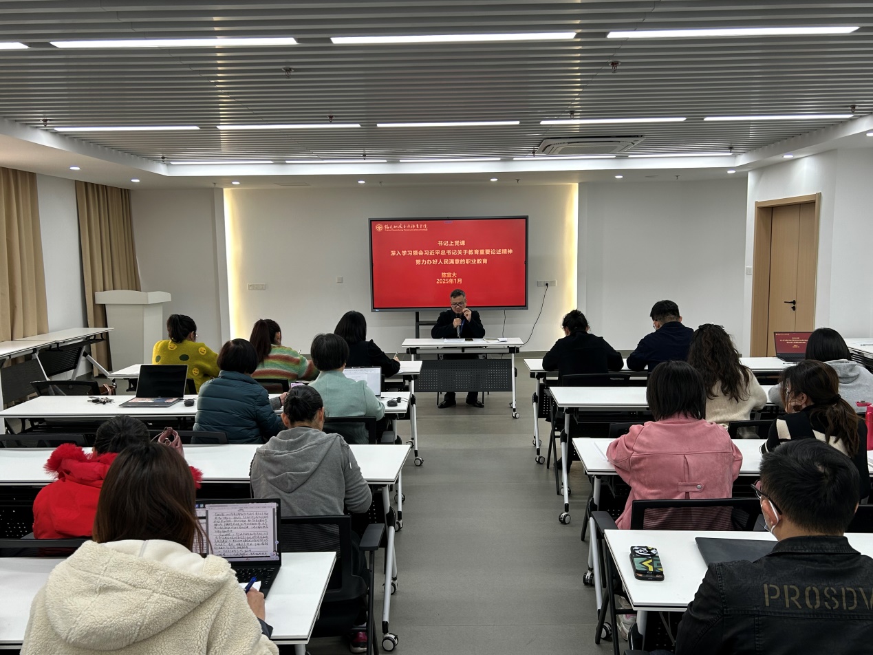 為全面理解和深刻把握習(xí)近平總書記關(guān)于教育的重要論述,進(jìn)一步激發(fā)全體思政課教師的教育情懷和使命擔(dān)當(dāng),1月8日下午,學(xué)院黨委書記陳宜大以《深入學(xué)習(xí)領(lǐng)會(huì)習(xí)近平總書記關(guān)于教育的重要論述 努力辦好人民滿意的職業(yè)育》為題到馬克思主義學(xué)院講授專題黨課。馬克思主義學(xué)院領(lǐng)導(dǎo)班子成員、全體思政課教師參加黨課學(xué)習(xí)。