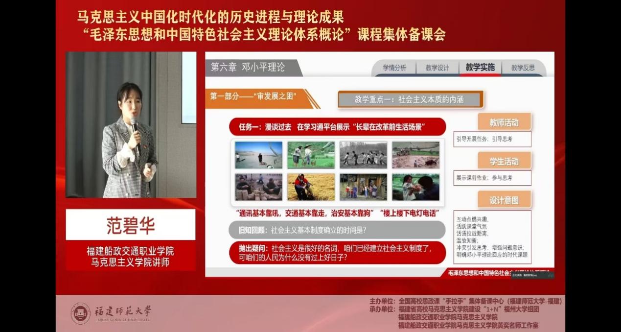 本次集備會(huì)由全國(guó)高校思政課“手拉手”集體備課中心(福建師范大學(xué)—福建省)主辦,福建省高校馬克思主義學(xué)院建設(shè)“1+N”福州大學(xué)組團(tuán)、福建船政交通職業(yè)學(xué)院馬克思主義學(xué)院、福建船政交通職業(yè)學(xué)院馬克思主義學(xué)院黃奕名師工作室承辦。概論教研室教師范碧華在本次集體備課會(huì)中進(jìn)行說(shuō)課展示,其他教師在線下共同觀摩學(xué)習(xí)。