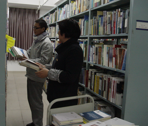 在學(xué)院“兩訪兩創(chuàng)”及“三風(fēng)建設(shè)”工作如火如荼開(kāi)展之際,圖書(shū)館積極緊跟學(xué)院步伐,館中黨員、年青工作人員發(fā)揮先鋒模范作用,利用每周一、周四兩個(gè)晚上、周三下午進(jìn)行加班加點(diǎn)。帶班老師組織勤工儉學(xué)同學(xué)及義工對(duì)圖書(shū)館8樓的密集圖書(shū)進(jìn)行分類整理、上架。密集圖書(shū)灰塵大、數(shù)量多,給分類、整理及上架工作帶來(lái)不小的挑戰(zhàn),但加班的師生不懼困難,他們分組有序地進(jìn)行分類、調(diào)撥、打包、上架,干十足勁。