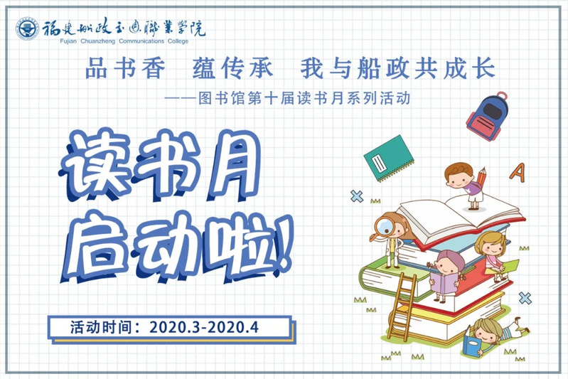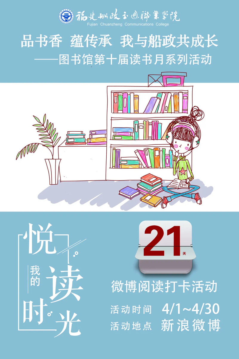 為了引導(dǎo)廣大師生養(yǎng)成多讀書(shū)、讀好書(shū)、好讀書(shū)的習(xí)慣,在第25個(gè)“世界讀書(shū)日”來(lái)臨之際,我院圖書(shū)館于2020年3月—4月開(kāi)展“品書(shū)香,蘊(yùn)船政,我與船政共成長(zhǎng)”圖書(shū)館第十屆讀書(shū)月系列活動(dòng),活動(dòng)包含豐富多彩、形式多樣的線(xiàn)上閱讀活動(dòng),同時(shí)我們也為大家準(zhǔn)備了各種精美的禮品。希望廣大師生及時(shí)關(guān)注我館的微博、微信公眾號(hào),歡迎大家的參與!