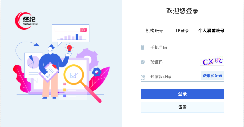 個人登錄注冊,需在學校IP范圍內,選擇“個人漫游賬號”,通過手機號注冊,即可在學校IP范圍外訪問。
