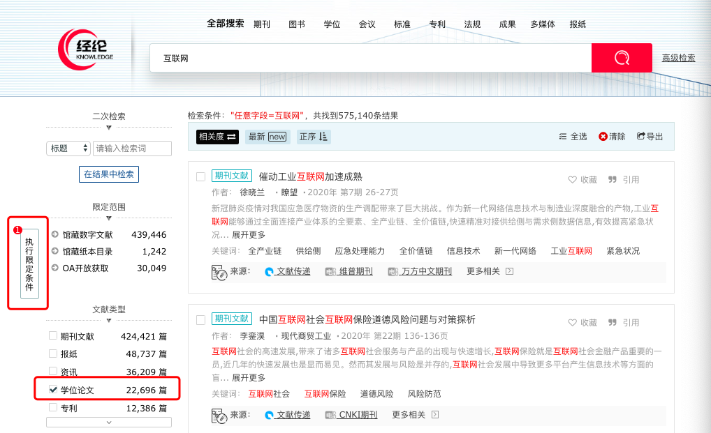 在經(jīng)綸的首頁可快速搜素10億級文獻數(shù)據(jù)的資源檢索,搜索關鍵詞“互聯(lián)網(wǎng)”,有57萬余篇文獻,在左側可進行二次篩選:舉例:選擇“學位論文”--點擊“執(zhí)行限定條件”,排序上可以選擇“相關度、最新、正序”