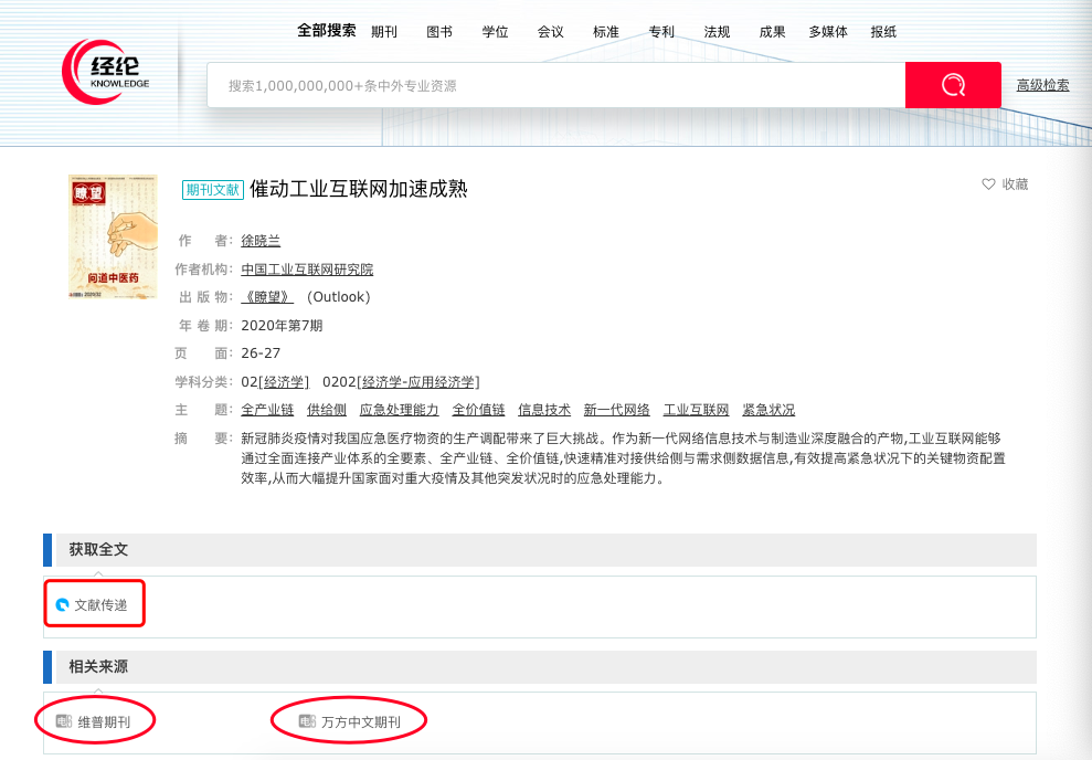 讀者選擇一篇文獻后,可以在文獻下的相關來源來查看全文,如下圖:可以點擊維普期刊或萬方中文期刊查看。也可以點擊右側的“收藏”按鈕,把此文獻收藏在個人收藏中心。