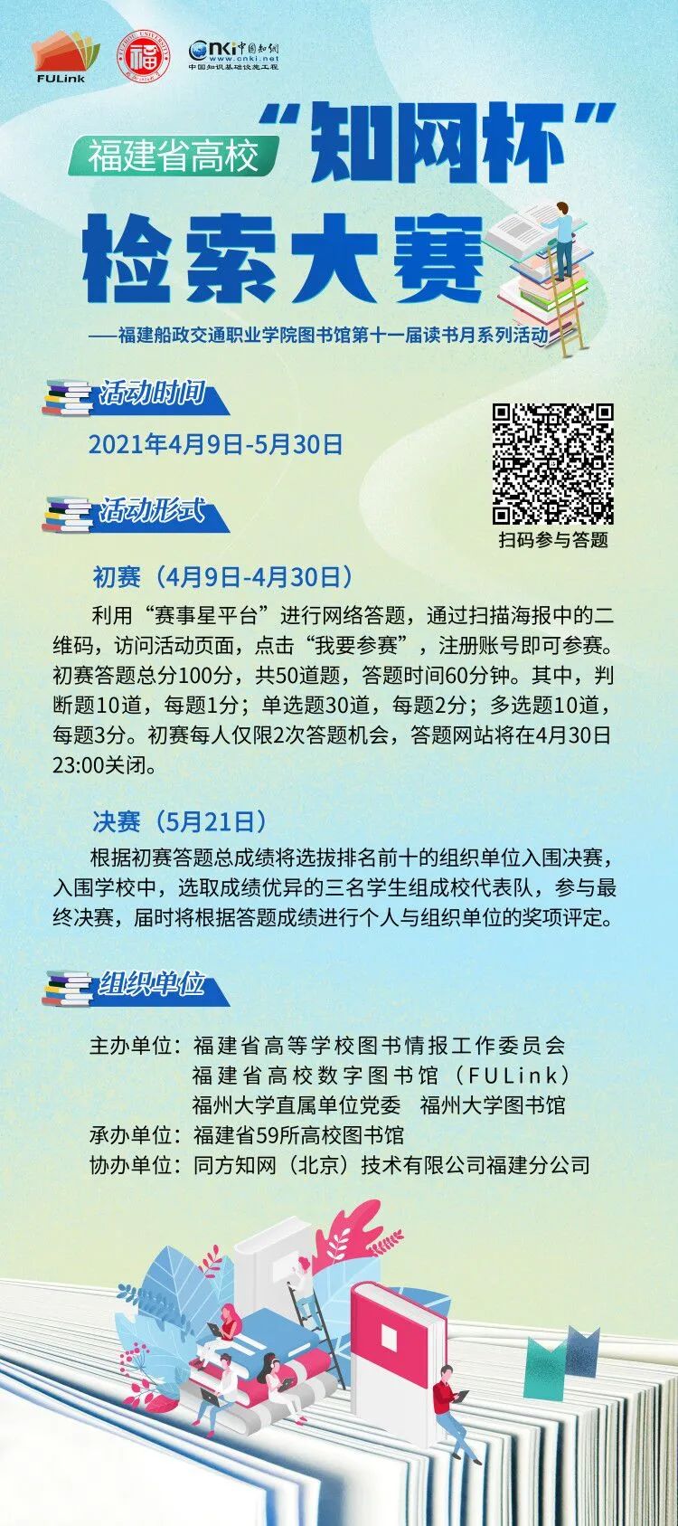 2021年是中國共產(chǎn)黨成立100周年,也是“十四五”開局之年,在第26個“世界讀書日”到來之際,福建省高等學(xué)校圖書情報工作委員會特舉辦“知網(wǎng)杯”檢索大賽,號召在校大學(xué)生學(xué)習(xí)黨史,養(yǎng)浩然正氣,努力踐行習(xí)近平總書記“修身慎行,懷德自重,敦方正直,清廉自守”的要求,希望以賽促學(xué),獻(xiàn)禮黨慶?,F(xiàn)將有關(guān)事項通知如下: