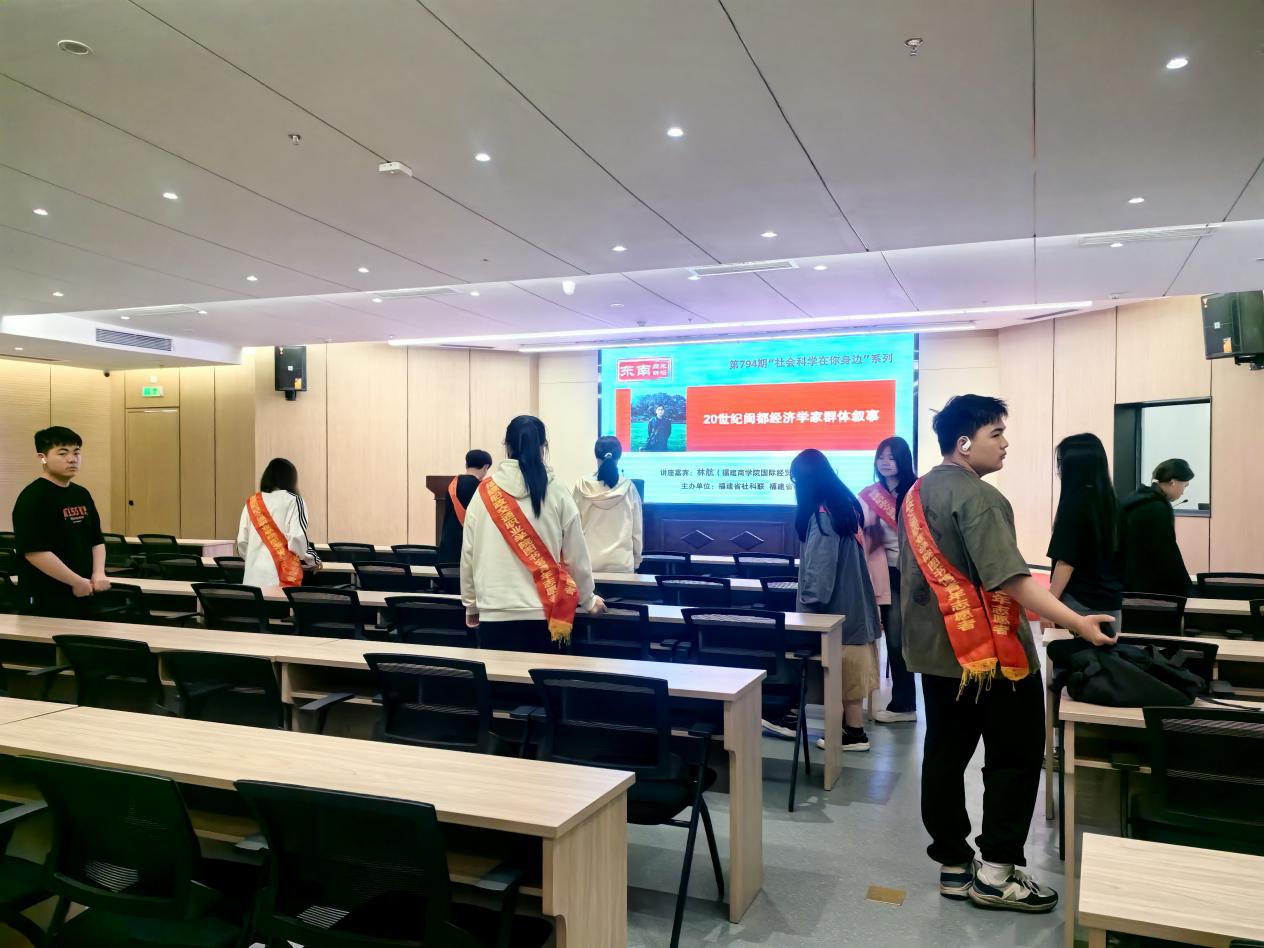 同學(xué)們在志愿服務(wù)的同時(shí),還觀摩了福建商學(xué)院國際經(jīng)貿(mào)學(xué)院副教授、博士、福建商學(xué)院閩商研究中心特約研究員林航作“20世紀(jì)閩都經(jīng)濟(jì)學(xué)家群體敘事”的專題講座。講座講述的是以“船政人物”嚴(yán)復(fù)為代表的閩都經(jīng)濟(jì)學(xué)家發(fā)揚(yáng)斗爭精神,賡續(xù)閩學(xué)基因,對舶來經(jīng)濟(jì)學(xué)說中國化的探索歷程綿延百年,為中國經(jīng)濟(jì)學(xué)建設(shè)注入閩學(xué)精神,他們的開創(chuàng)性貢獻(xiàn)值得銘記和緬懷。在講座最后的問答互動(dòng)環(huán)節(jié)中,林航副教授親切熱情、娓娓道來地回答了同學(xué)們關(guān)注的問題。