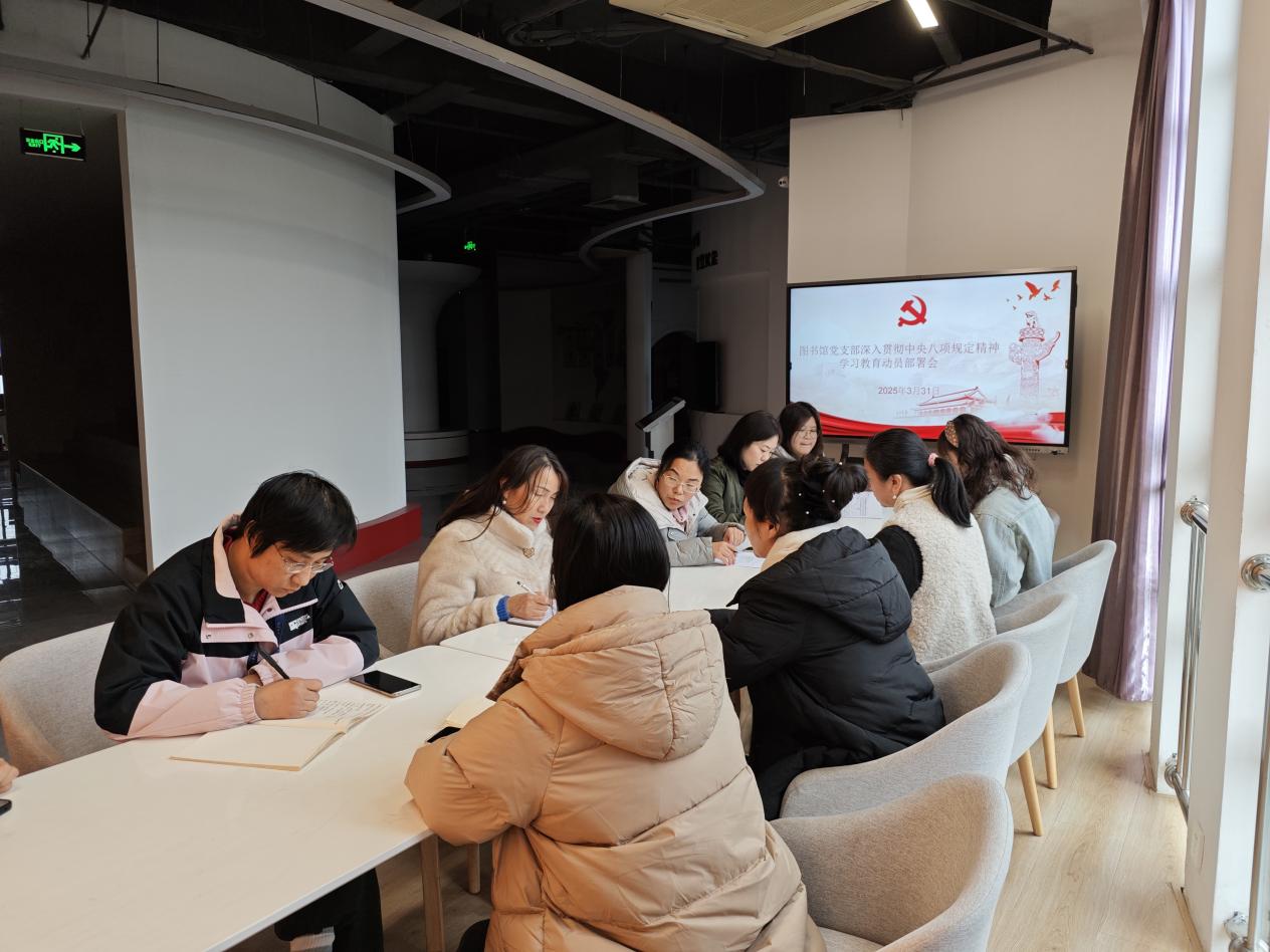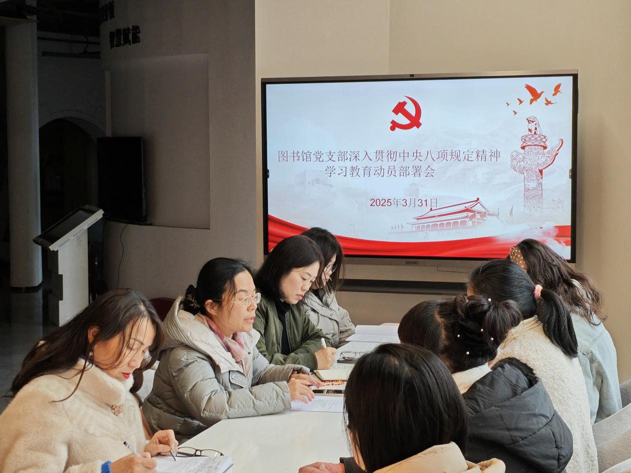 2025年3月31日,圖書(shū)館黨支部召開(kāi)專(zhuān)題會(huì)議,會(huì)議傳達(dá)了學(xué)院關(guān)于深入貫徹中央八項(xiàng)規(guī)定精神學(xué)習(xí)教育動(dòng)員會(huì)議的工作部署要求,全面動(dòng)員和部署支部學(xué)習(xí)教育工作。會(huì)議由黨支部陳林書(shū)記主持,全體黨員參加。陳林書(shū)記指出,開(kāi)展此次習(xí)教育是落實(shí)習(xí)近平總書(shū)記重要指示精神、鞏固深化主題教育成果、推進(jìn)全面從嚴(yán)治黨向基層延伸的重要舉措。支部全體黨員干部要提高政治站位,深刻認(rèn)識(shí)作風(fēng)建設(shè)對(duì)學(xué)院高質(zhì)量發(fā)展、師德師風(fēng)建設(shè)及服務(wù)師生的重要意義,切實(shí)將思想和行動(dòng)統(tǒng)一到黨中央決策部署上來(lái)。會(huì)議強(qiáng)調(diào),要結(jié)合圖書(shū)館工作實(shí)際,學(xué)深悟透,通過(guò)集中學(xué)習(xí)、個(gè)人自學(xué)等形式,深入領(lǐng)會(huì)中央八項(xiàng)規(guī)定精神的核心要義,將作風(fēng)建設(shè)貫穿文獻(xiàn)資源服務(wù)、讀者服務(wù)、內(nèi)部管理全過(guò)程;查改結(jié)合,對(duì)照黨章黨規(guī)和崗位職責(zé),全面查擺服務(wù)意識(shí)、工作效能、紀(jì)律執(zhí)行等方面存在的問(wèn)題,建立整改臺(tái)賬并限期落實(shí);長(zhǎng)效常治,將學(xué)習(xí)教育與巡視整改相結(jié)合,完善制度規(guī)范,推動(dòng)作風(fēng)建設(shè)常態(tài)化、制度化。