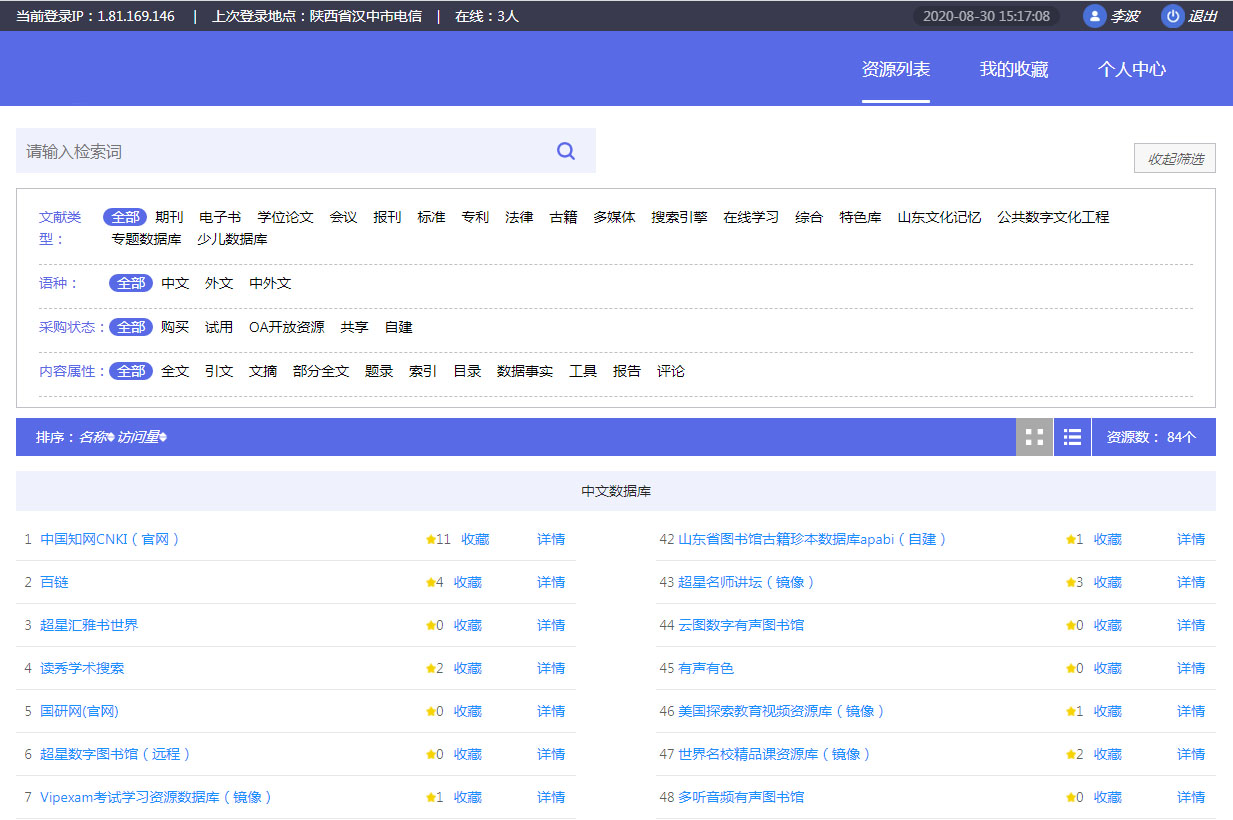 在登陸后的電子資源界面里我們能夠看到圖書(shū)館已對(duì)我們開(kāi)放的電子資源,在點(diǎn)擊相應(yīng)的電子資源名稱(chēng)后便能夠?yàn)g覽其中的內(nèi)容了、經(jīng)常使用的可以收藏起來(lái),方便下次使用。
