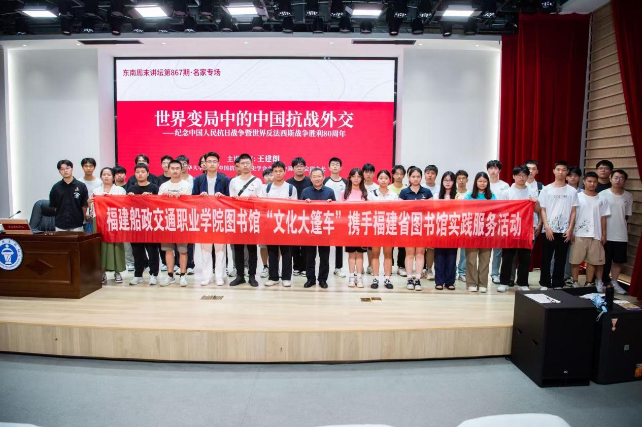 9月6日上午,我館“文化大篷車”團(tuán)隊走進(jìn)福建省圖書館,為“東南周末講壇”提供志愿服務(wù),志愿者協(xié)助完成講座接待、引賓導(dǎo)覽、資料發(fā)放等服務(wù),保障活動有序開展,并聆聽了清華大學(xué)教授、中國抗日戰(zhàn)爭史學(xué)會會長王建朗主講的《世界變局中的中國抗戰(zhàn)外交》講座。王教授以世界變局中的中國外交智慧為主線,剖析抗戰(zhàn)時期中國如何突破外交困局、爭取國際支持的歷史經(jīng)驗(yàn),強(qiáng)調(diào)抗戰(zhàn)精神對當(dāng)代青年的啟示——銘記民族苦難輝煌,筑牢愛國信念根基。講座深化了學(xué)生對歷史縱深的理解,激發(fā)傳承紅色基因的行動自覺。