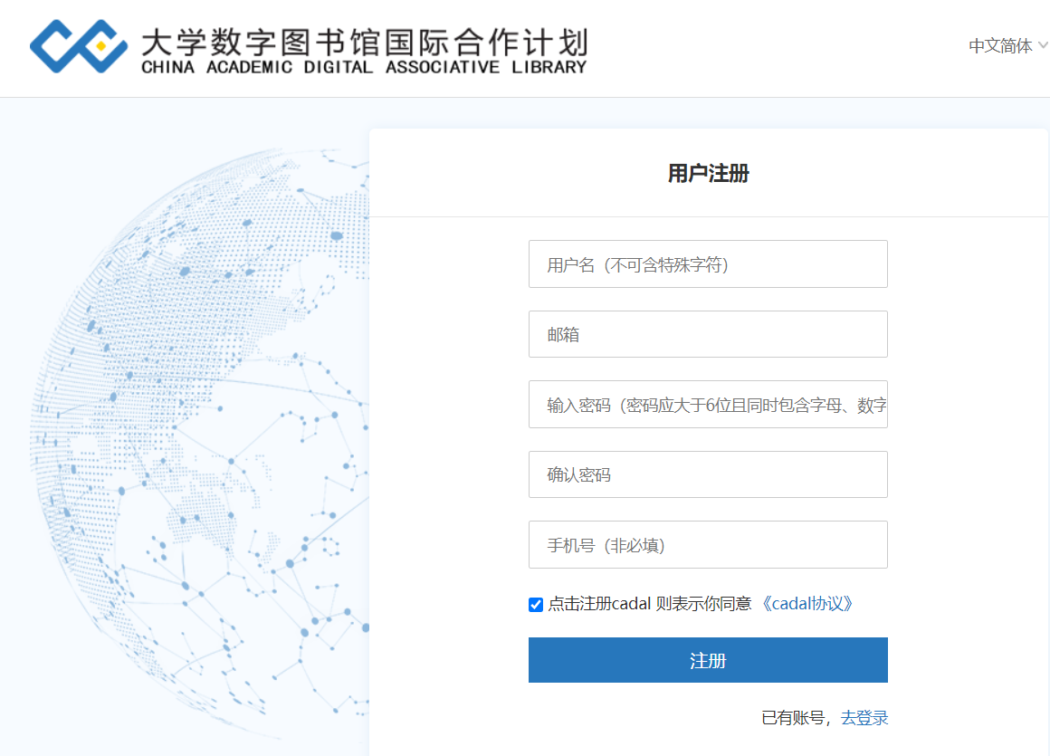 訪問CADAL官網(wǎng)(搜索:大學數(shù)字圖書館國際合作計劃),點擊右上角“登錄/注冊”即可打開登錄頁面。