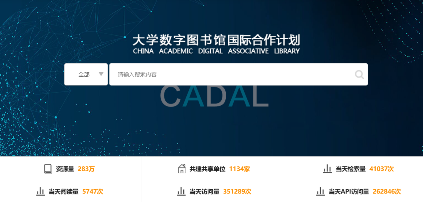 CADAL全稱為“大學數(shù)字圖書館國際合作計劃”,以“共建共享”理念,整合國內(nèi)高校圖書館、圖書情報服務機構(gòu)、學術研究機構(gòu)所擁有或生產(chǎn)的各類信息資源及其相關服務,有重點地引進、共享國際相關機構(gòu)的各類信息資源與服務。