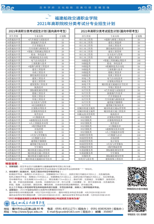 福建船政交通職業(yè)學(xué)院2021年高職院校分類考試分專業(yè)招生計(jì)劃