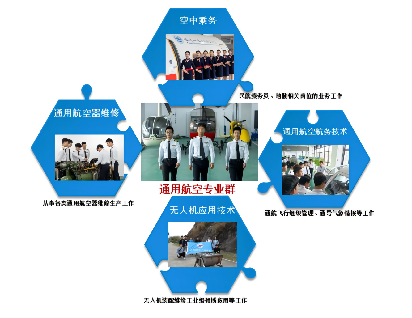 通用航空器維護(hù)基礎(chǔ),航空發(fā)動機(jī)構(gòu)造與檢修,航空電氣設(shè)備與檢修,飛機(jī)鉚接與機(jī)體修理,飛行維護(hù),通用航空器機(jī)型維護(hù),航空材料無損檢測等。