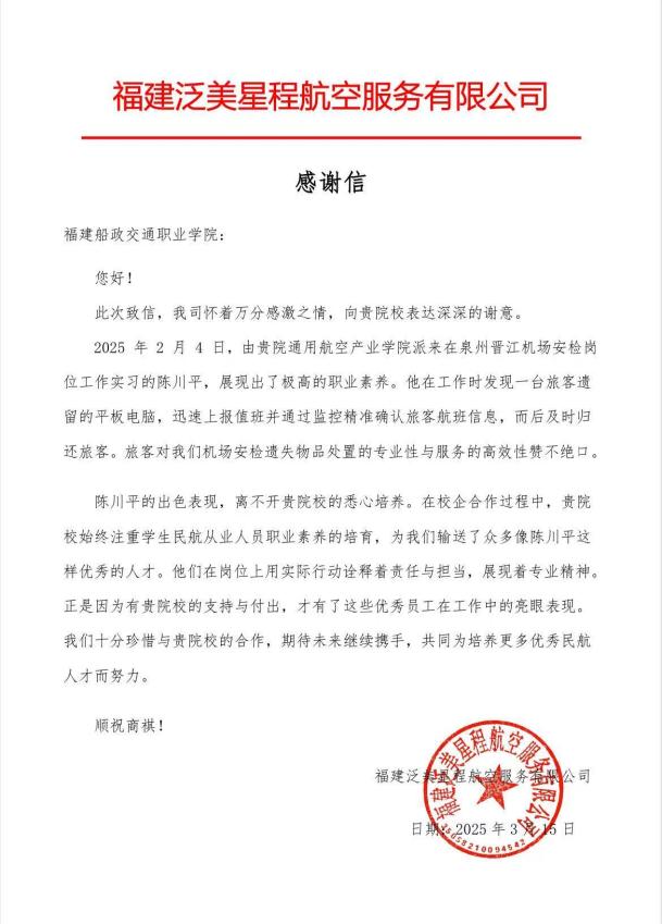 近日,福建船政交通職業(yè)學(xué)院通用航空航空產(chǎn)業(yè)學(xué)院收到福建泛美星程航空服務(wù)有限公司的感謝信,高度贊揚(yáng)我院實(shí)習(xí)生陳川平在泉州晉江機(jī)場安檢崗位的突出表現(xiàn)。信中提及,陳川平在執(zhí)勤時發(fā)現(xiàn)旅客遺失的平板電腦后,迅速通過監(jiān)控鎖定失主并高效歸還,其專業(yè)素養(yǎng)與責(zé)任意識獲得企業(yè)及旅客一致認(rèn)可。企業(yè)充分肯定我院“產(chǎn)教融合、德技并修”的育人理念,認(rèn)為此類優(yōu)秀案例是校企協(xié)同育人成果的直接體現(xiàn)。