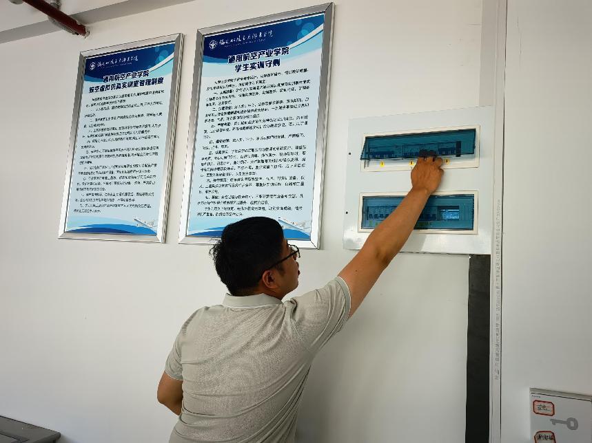 為做好假期實(shí)驗(yàn)室安全管理工作,排查實(shí)驗(yàn)室安全隱患,防范安全事故,筑牢學(xué)院實(shí)驗(yàn)室安全防線。7月1日下午,我院實(shí)訓(xùn)中心老師對(duì)學(xué)院在藝新樓內(nèi)的8間實(shí)訓(xùn)室,一樓走廊的空乘模擬艙、撤離平臺(tái)和在停機(jī)坪的A320大飛機(jī)、直升機(jī)等場(chǎng)地和設(shè)備開展安全檢查。