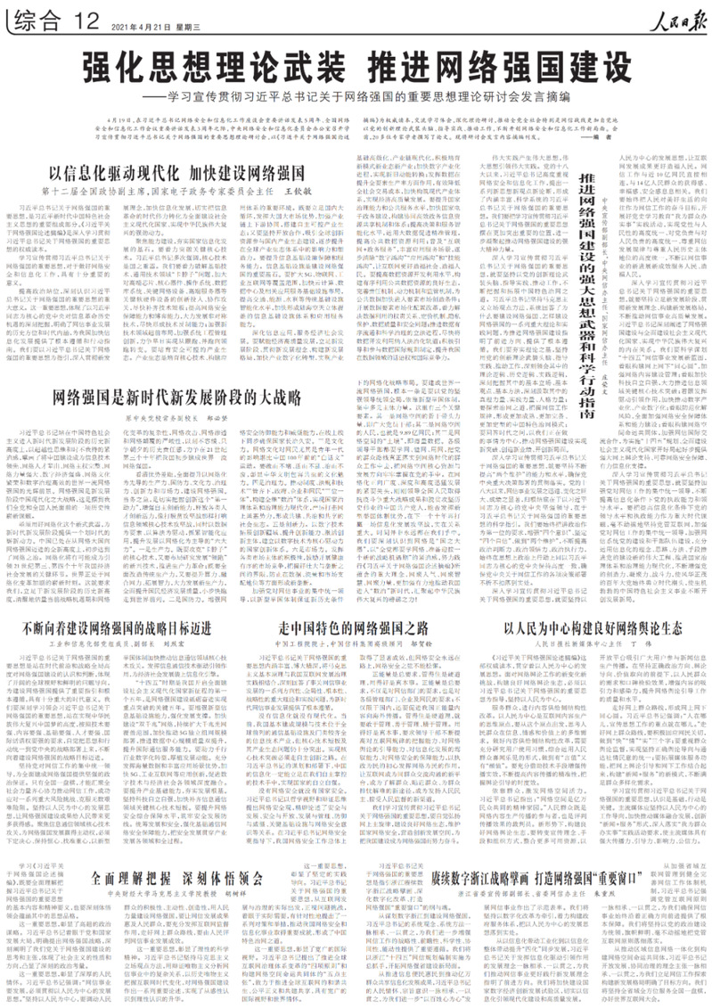 4月19日,在習(xí)近平總書(shū)記網(wǎng)絡(luò)安全和信息化工作座談會(huì)重要講話發(fā)表5周年、全國(guó)網(wǎng)絡(luò)安全和信息化工作會(huì)議重要講話發(fā)表3周年之際,中央網(wǎng)絡(luò)安全和信息化委員會(huì)辦公室召開(kāi)學(xué)習(xí)宣傳貫徹習(xí)近平總書(shū)記關(guān)于網(wǎng)絡(luò)強(qiáng)國(guó)的重要思想理論研討會(huì),以《習(xí)近平關(guān)于網(wǎng)絡(luò)強(qiáng)國(guó)論述摘編》為權(quán)威讀本,交流學(xué)習(xí)體會(huì),深化理論研討,推動(dòng)全黨全社會(huì)特別是網(wǎng)信戰(zhàn)線更加自覺(jué)地以黨的創(chuàng)新理論武裝頭腦、指導(dǎo)實(shí)踐、推動(dòng)工作,不斷開(kāi)創(chuàng)網(wǎng)絡(luò)安全和信息化工作新局面。會(huì)前,20多位專家學(xué)者撰寫(xiě)了論文。4月21日出版的人民日?qǐng)?bào)專版摘編刊發(fā)理論研討會(huì)發(fā)言內(nèi)容。