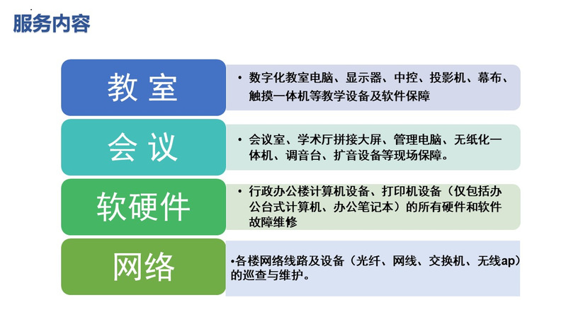 組建服務團隊有效提升教室信息化設備維保維修響應效率,提高了會議室、報告廳等設備使用保障能力,更好地滿足教育教學的需要。