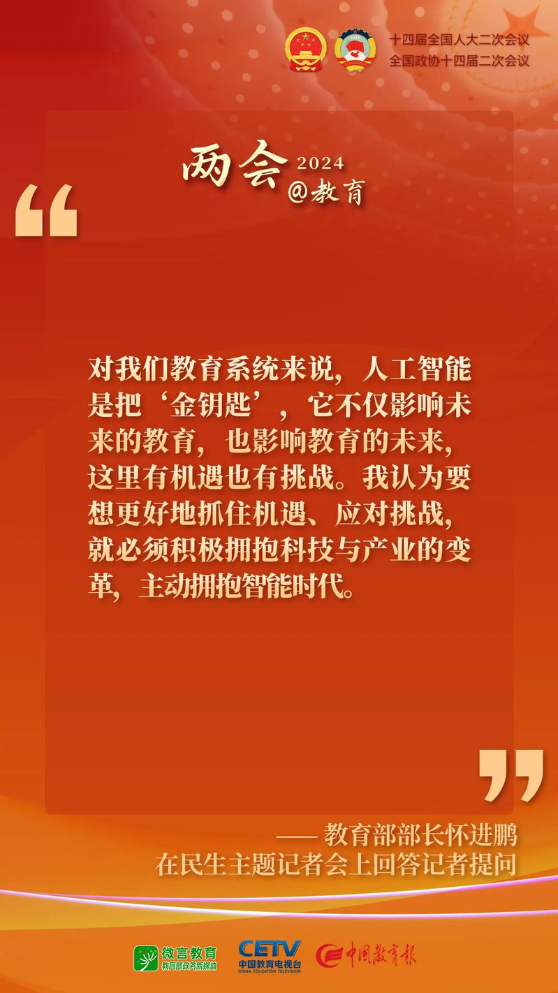我們還要做優(yōu)公共服務(wù)資源,搭建學(xué)習(xí)型系統(tǒng),實(shí)現(xiàn)終身教育的數(shù)字平臺(tái)。說到這里,今年兩會(huì)當(dāng)中還有一個(gè)熱議的話題,也是這一段時(shí)間大家談得比較多的,就是人工智能與教育。政府工作報(bào)告當(dāng)中提出開展“人工智能+”行動(dòng),對(duì)我們教育系統(tǒng)來說,人工智能是把“金鑰匙”,它不僅影響未來的教育,也影響教育的未來,這里有機(jī)遇也有挑戰(zhàn)。我認(rèn)為要想更好地抓住機(jī)遇、應(yīng)對(duì)挑戰(zhàn),就必須積極擁抱科技與產(chǎn)業(yè)的變革,主動(dòng)擁抱智能時(shí)代。未來,我們將致力于培養(yǎng)一大批具備數(shù)字素養(yǎng)的教師,加強(qiáng)我們教師隊(duì)伍的建設(shè),把人工智能技術(shù)深入到教育教學(xué)和管理全過程、全環(huán)節(jié),來研究它的有效性、適應(yīng)性,讓青年一代更加主動(dòng)地學(xué),讓教師更加創(chuàng)造性地教。同時(shí),我們會(huì)加強(qiáng)人工智能相關(guān)學(xué)科專業(yè)的高層次人才培養(yǎng),提升科學(xué)研究創(chuàng)新能力,加快平臺(tái)建設(shè)。