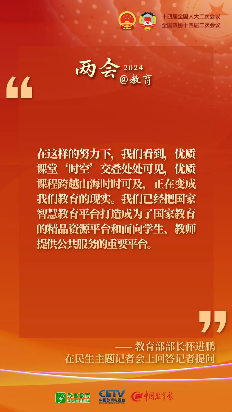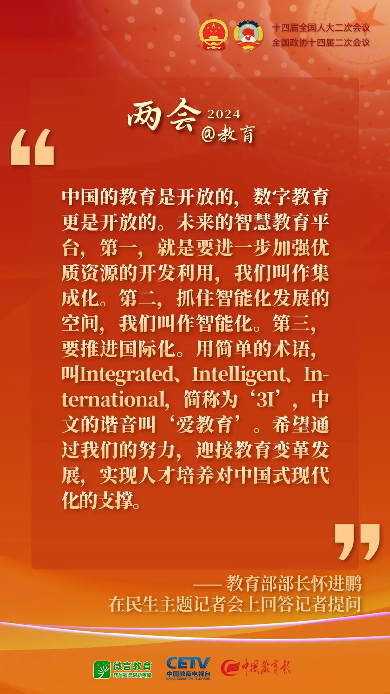十四屆全國人大二次會(huì)議于3月9日下午舉行民生主題記者會(huì),教育部部長懷進(jìn)鵬就教育相關(guān)問題回答中外記者提問。其中,關(guān)于數(shù)字教育,懷進(jìn)鵬部長做了哪些回答?下一步數(shù)字教育將采取哪些重點(diǎn)的舉措?……一起來看現(xiàn)場答問記錄