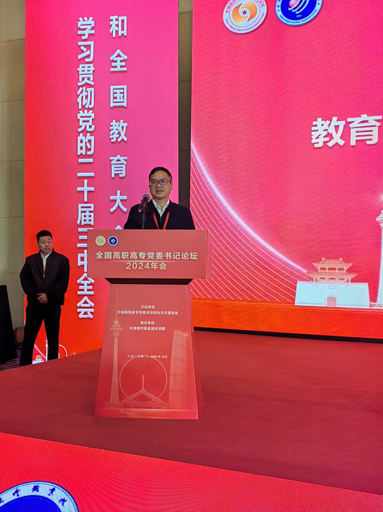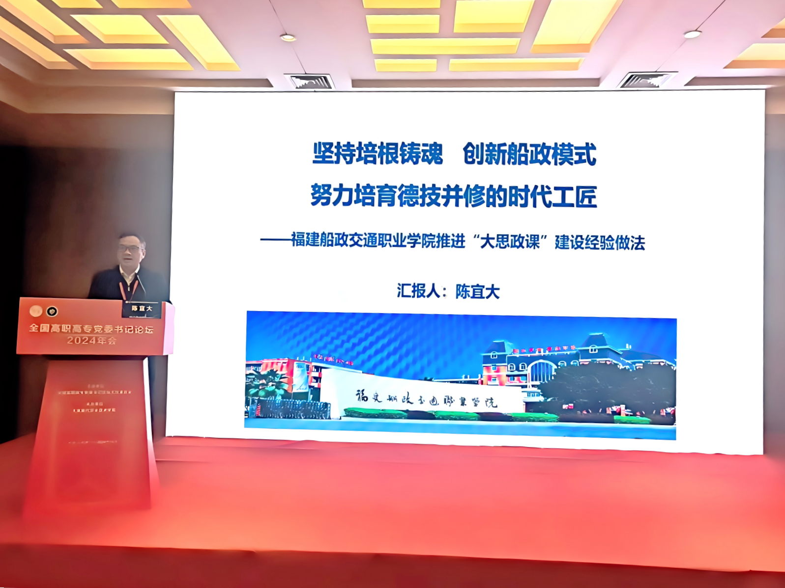 近日,全國高職高專黨委書記論壇2024年會在天津舉辦,全國高職高專黨委書記論壇副主任委員、我院黨委書記陳宜大參加主持,并作題為《堅持培根鑄魂 創(chuàng)新船政模式,努力培育德技并修的時代工匠——福建船政交通職業(yè)學院推進“大思政課”建設經驗》的報告,介紹學院思政育人工作。