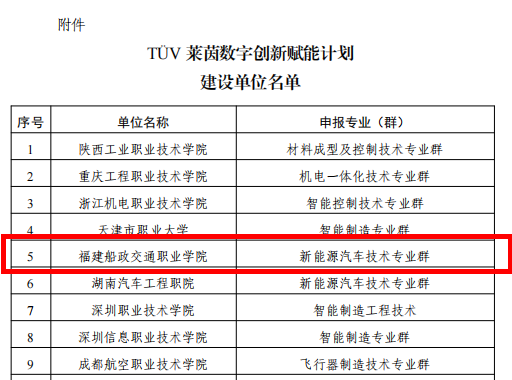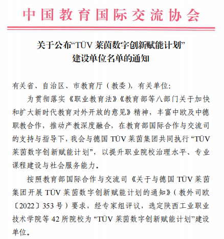 2023314日,中國教育國際交流協(xié)會公布了“TüV萊茵數(shù)字創(chuàng)新賦能計劃”建設(shè)單位名單。我校成為建設(shè)單位之一,新能源技術(shù)專業(yè)群被確立為建設(shè)專業(yè),在獲批名單內(nèi)排名第五。
