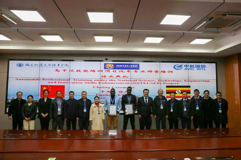 中航國際成套設(shè)備有限公司職業(yè)教育部部門經(jīng)理助理徐華京先生,學(xué)院教務(wù)處、科技處、對外交流中心等部門負(fù)責(zé)人參加了結(jié)業(yè)典禮,并與全體烏干達(dá)學(xué)員一同合影留念。