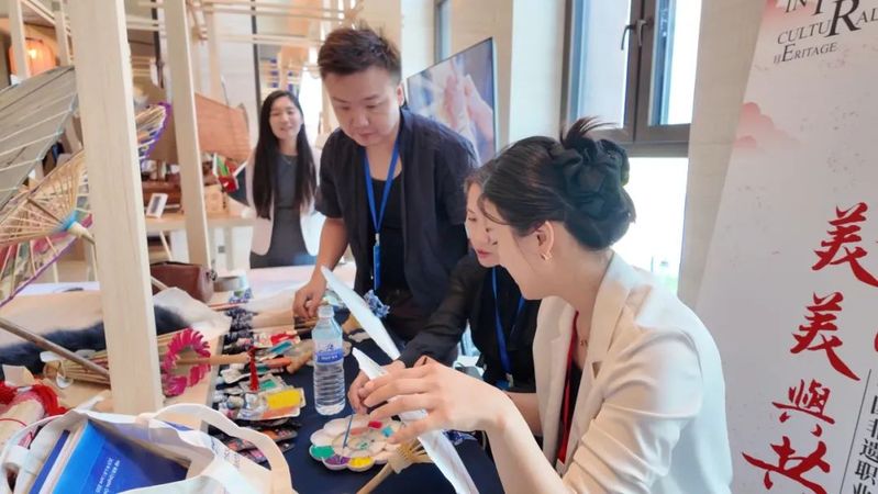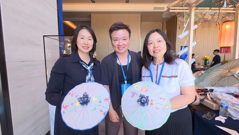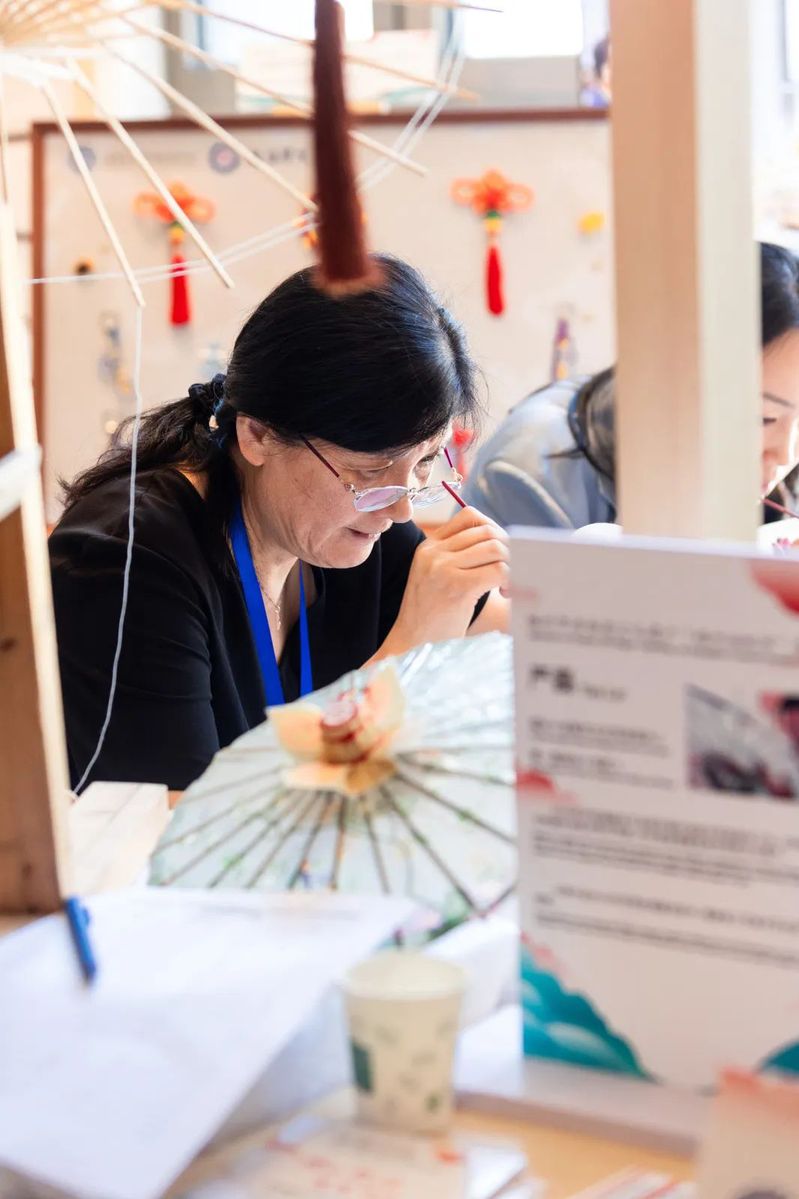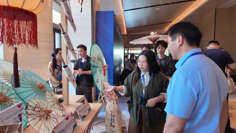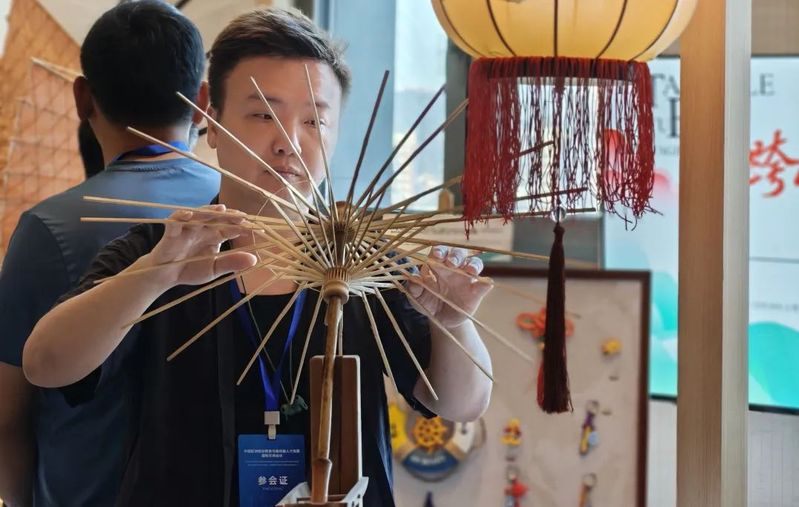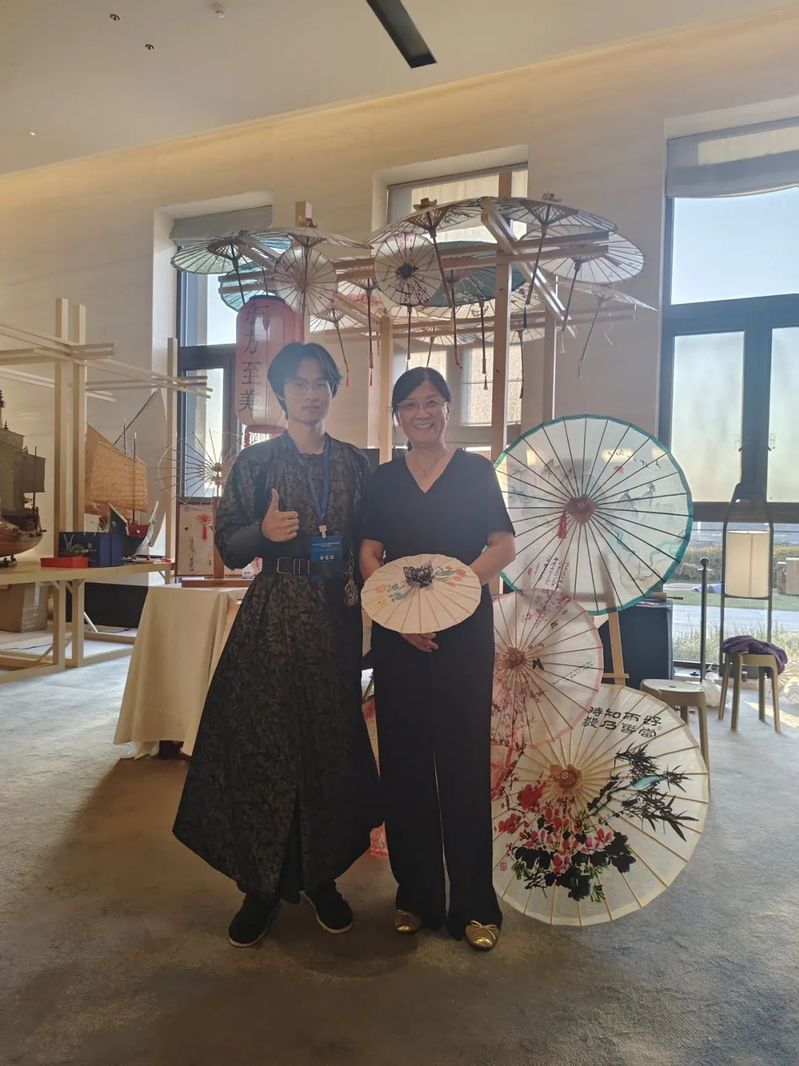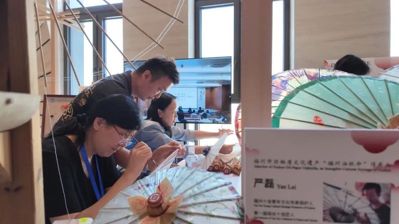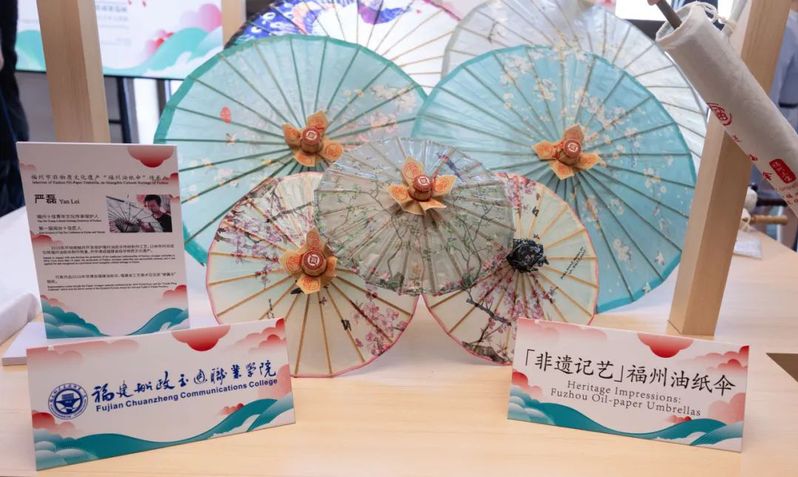 會議期間同步舉辦了“跨越山海 美美與共”中國非遺職業(yè)教育成果巡展之“非遺記藝”文化藝術交流展。我院非遺傳習社指導教師、通識教育學院教師林丹青與我院特聘非遺傳承人嚴磊帶領社團成員攜福建省第六批省級非物質文化遺產代表性項目——福州油紙傘制作技藝精彩亮相,成為展會上一道亮麗風景,向世界展示了我院在非遺傳承與職業(yè)教育融合創(chuàng)新中的豐碩成果。