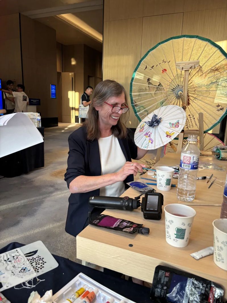 福州油紙傘不僅作為精美的藝術品被欣賞,更成為傳遞中華情誼、促進民心相通的橋梁。我院師生將精心制作的福州油紙傘作為象征友誼與祝福的文化禮物,贈予了到訪展位的各國友人。西班牙前首相薩帕特羅先生饒有興致地欣賞了油紙傘,并欣然接受了這份蘊含東方美意與匠心的禮物。中國歐盟協(xié)會秘書長宋敬武先生也對我院展示的福州非遺油紙傘項目給予了高度評價和特別關注,詳細詢問了項目在我院職業(yè)教育中的傳承與創(chuàng)新實踐。我院非遺傳承教育成果得到了來自與會各方的認可,并贊譽福州非遺油紙傘為連接中歐文明的獨特信物。